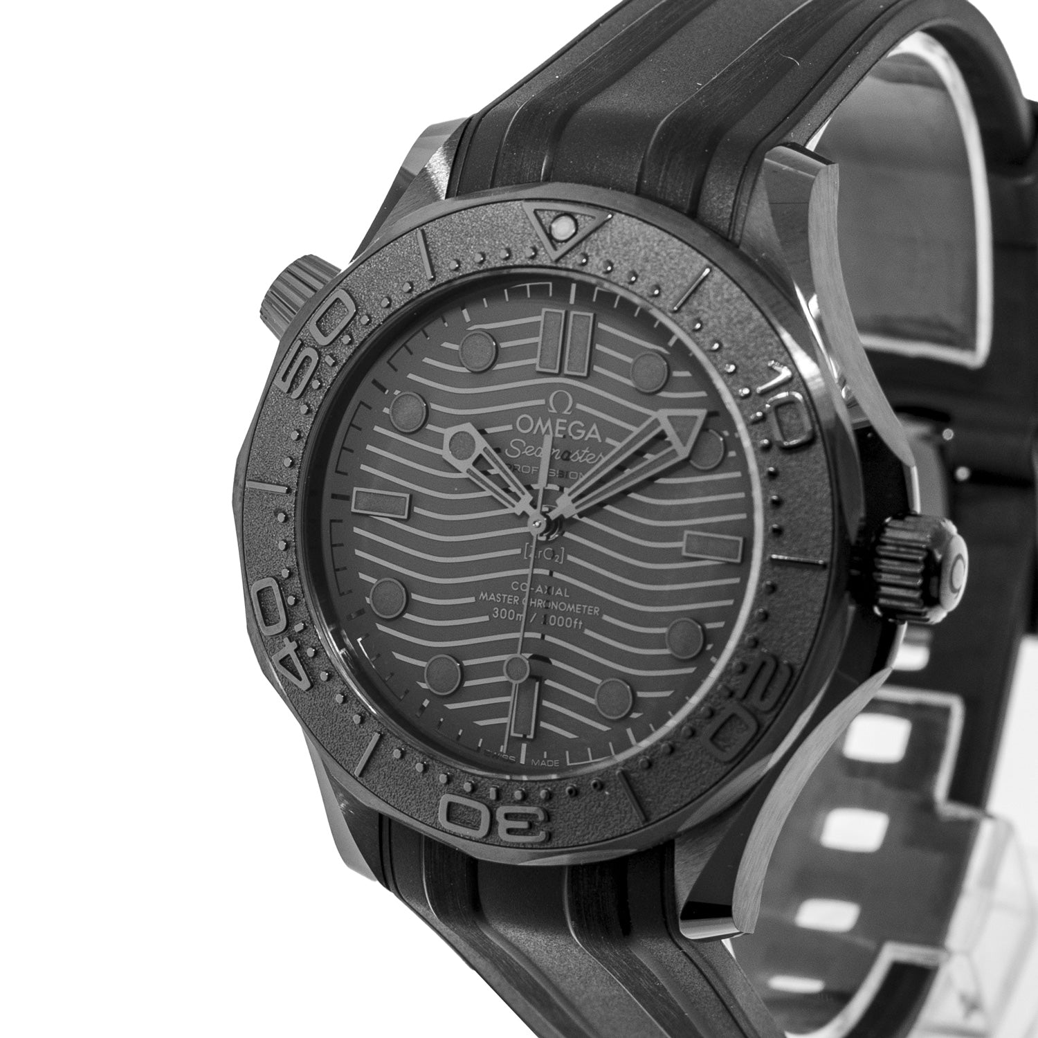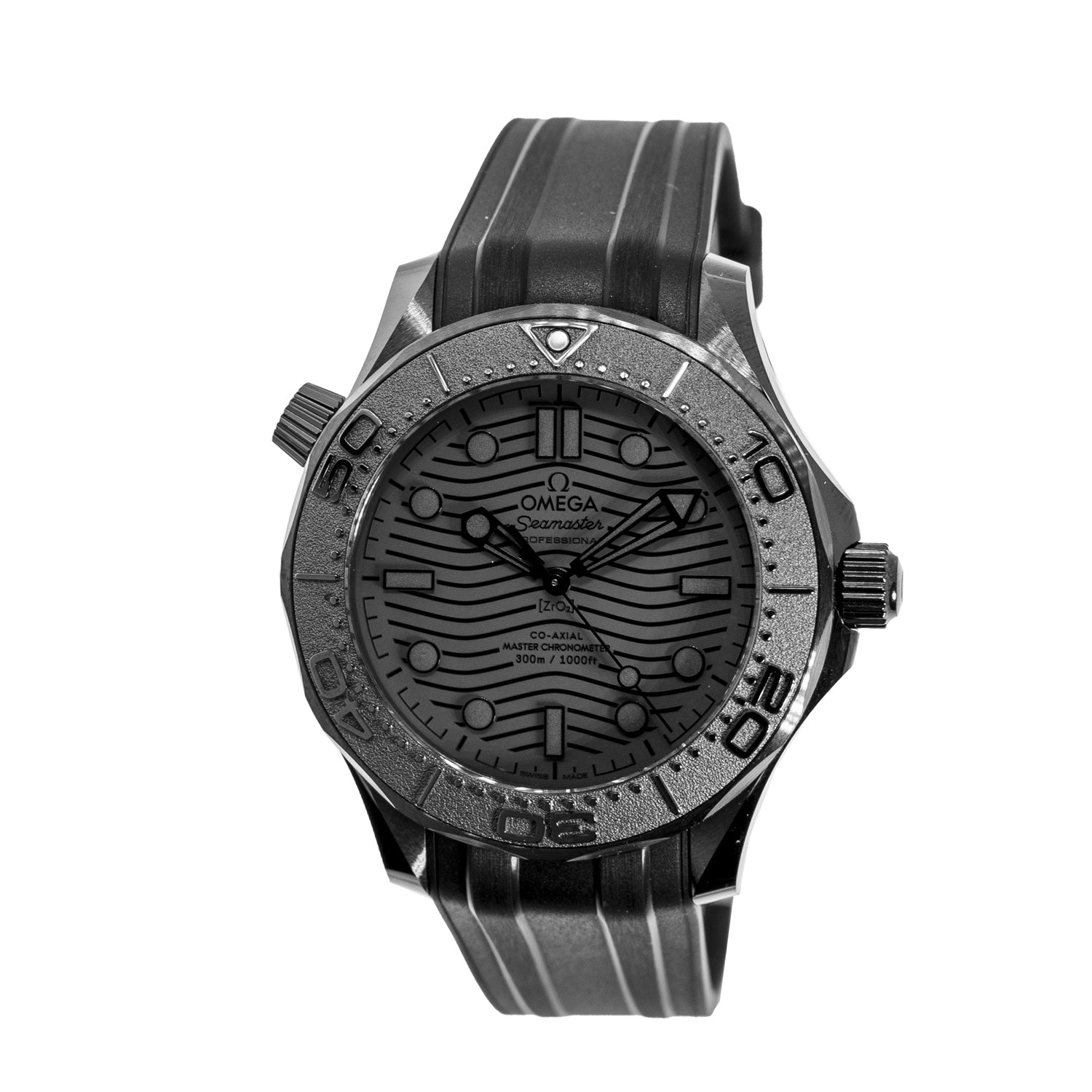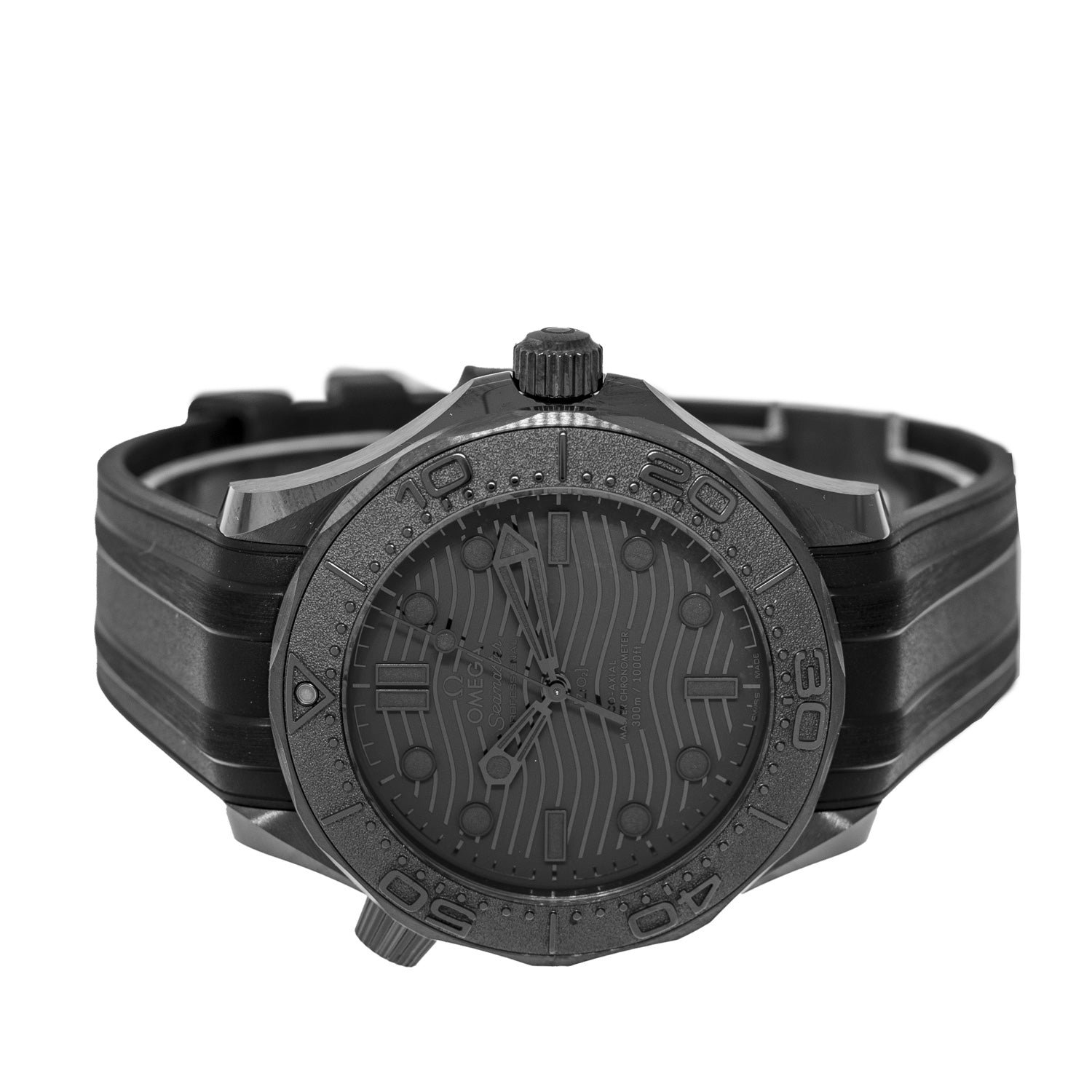 Guaranteed Authentic Omega Seamaster 300m Chronometer watch with a 43.5mm Black Ceramic case, a Black Index Dial, black ceramic bezel. This fine timepiece is waterproof up to 300 meters and features a See-through sapphire glass back, date indicator and black rubber Omega Strap. This watch is brand new with tags. It comes with a Two Year Warranty from Da Vinci Fine Jewelry, a Omega box, Omega papers, and a certified retail appraisal from Da Vinci Fine Jewelry, Inc. Take advantage of this great deal today!