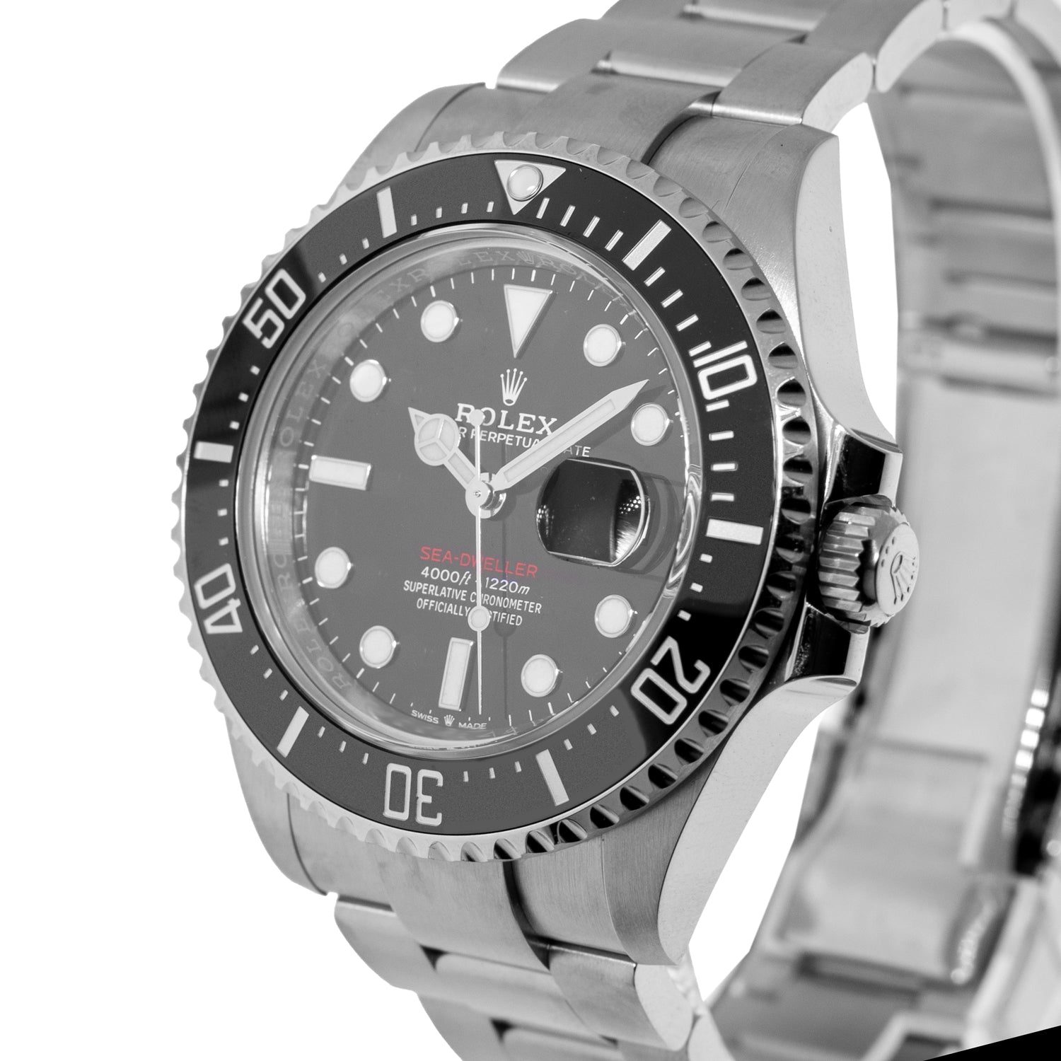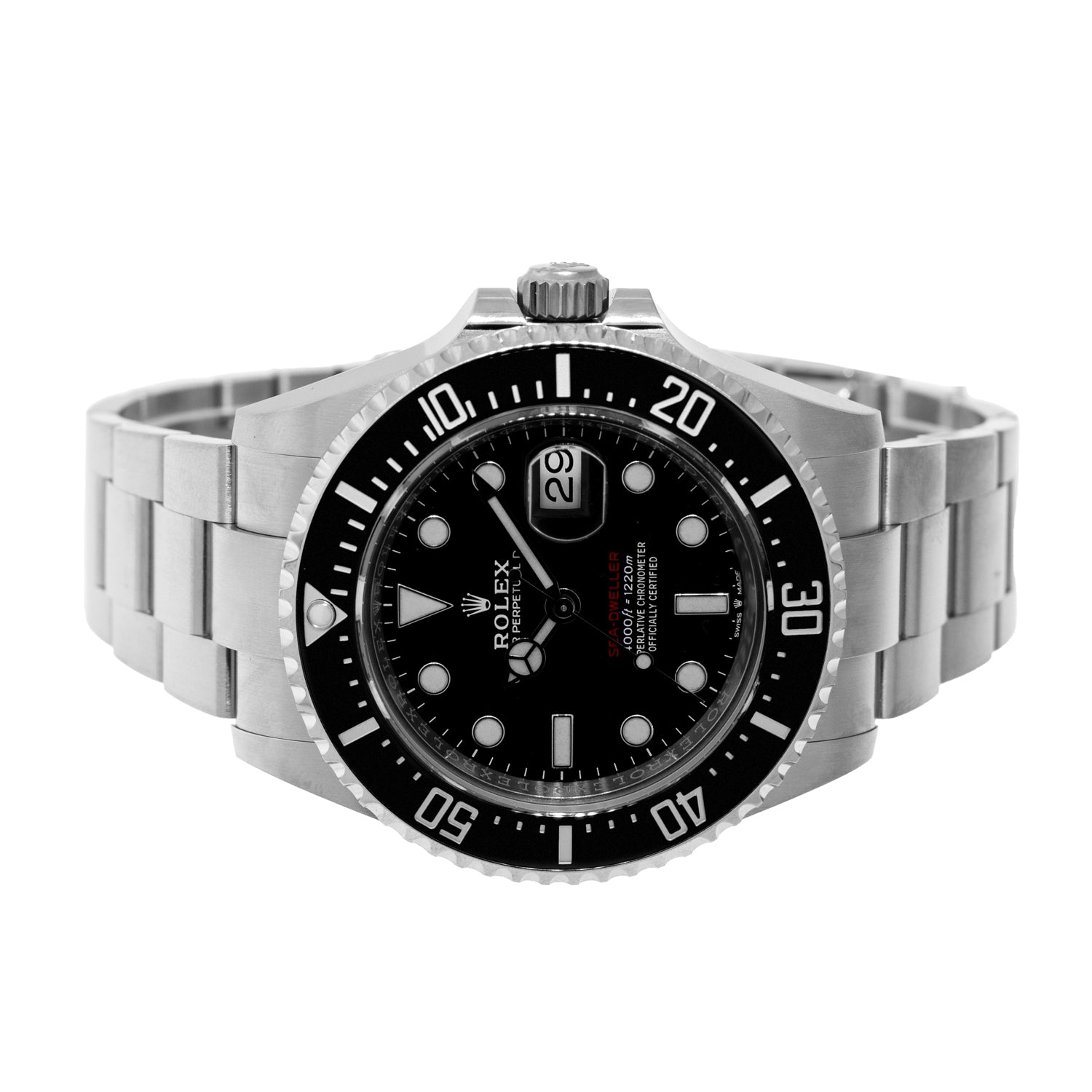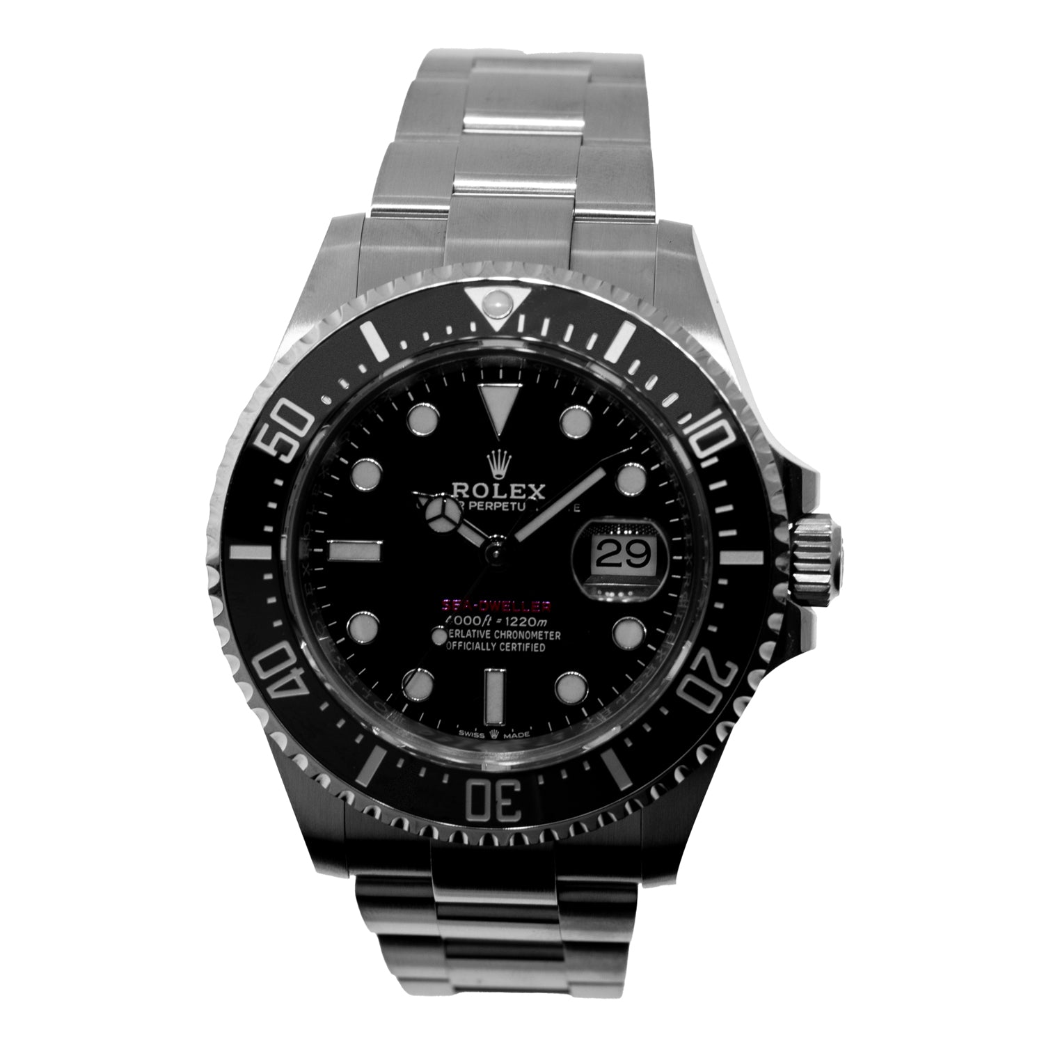 Guaranteed Authentic Men's Rolex Sea-Dweller with a 43mm stainless steel case and a black dial. This fine timepiece features a black Cerachrom bezel and a stainless steel Oyster bracelet. Waterproof to a depth of 1,220 metres (4,000 feet) with a unidirectional 60-minute rotatable bezel, the Rolex Sea-Dweller is amongst the ultra-resistant divers’ watches engineered by Rolex for deep-sea exploration. This watch is brand new, old stock (NOS) 2021 production with no stickers. It comes with a One Year Warranty from Da Vinci Fine Jewelry, Inc., a Rolex box and Rolex Warranty Card (2021), White Tag certified retail appraisal from Da Vinci Fine Jewelry, Inc.